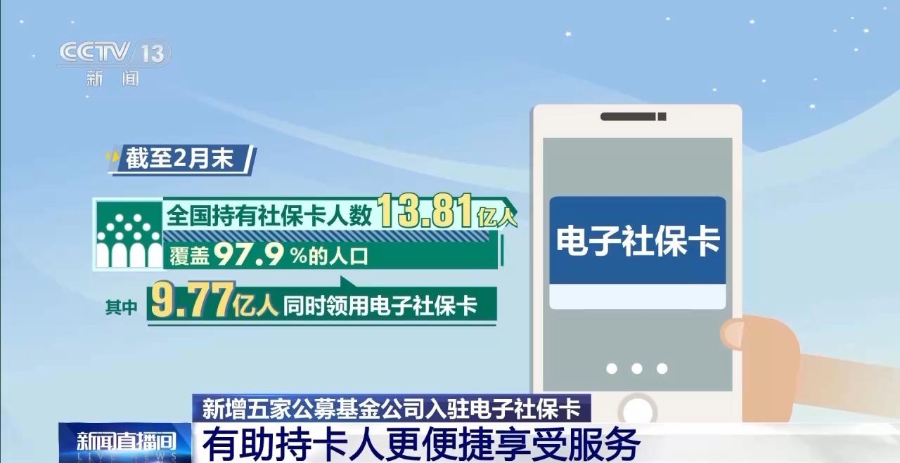 电子社保卡是持卡人线上享受人力资源社会保障等民生服务的电子凭证和结算工具。数据显示,截至2月末,全国持有社保卡人数达13.81亿人,覆盖97.9%的人口,其中9.77亿人同时领用了电子社保卡。