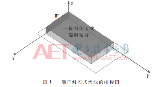 传统的矩形微带天线贴片与接地板之间的场具有以下特点:(1)电场只有Ex分量,磁场只有Hx和Hy分量,即微带天线辐射沿z轴方向的TM波;(2)内场不随z坐标变化;(3)四周边缘处电流无法向分量,即边缘处切向磁场为零,故空腔四周可视为磁壁。文献[7]通过将天线空腔的一个端口用铜箔封闭,如图1所示,介质上表面覆盖辐射贴片,辐射贴片长为L,宽为W。把xoz平面的左端口用铜箔封闭,这样就构成了一端口封闭的微带天线结构。