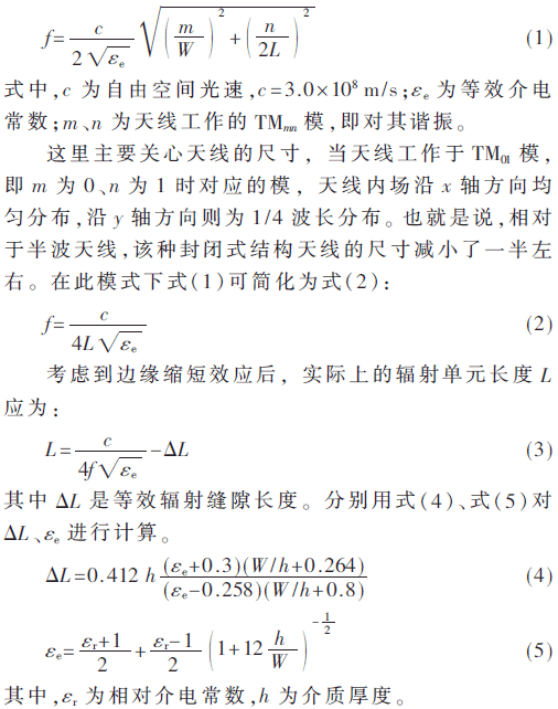 由于理想金属表面不存在电场的切向分量,从而使封闭端口所在的平面变成理想电壁。利用空腔理论对天线内场进行分析,矩形微带天线通常都工作于TM01模(或TM10模),可得到TMmn模的谐振频率为: