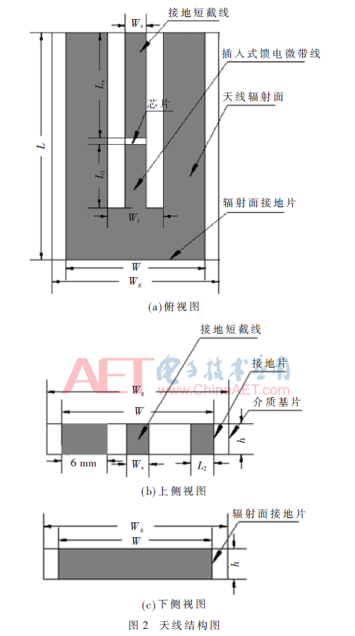 设计的抗金属天线由一端接地天线辐射面、接地短截线、两个短路片及接地平面构成。介质基板采用微波介质陶瓷,厚度为4 mm,相对介电常数为22,天线宽度W为20 mm,由式(3)计算得到辐射贴片长度L约为32 mm,天线各参数分布如图2所示。其中,L为辐射贴片整体长度,W为辐射贴片整体宽度,Wg为天线整体宽度,Li为插入式馈电微带线的长度,Wi为插入式馈电微带线的宽度,Ls为接地短截线的长度,Ws为接地短截线的宽度,L2为一端短路片长度。