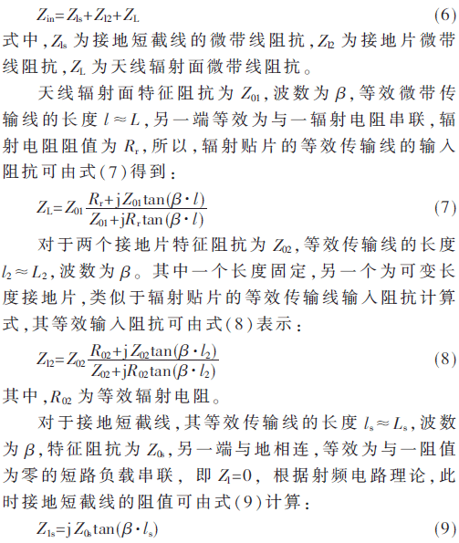 天线的辐射面、接地短截线和两个接地片分别等效为一段微带传输线,馈电端位于传输线之间,天线的输入阻抗为这三段微带线的串联阻抗值,即: