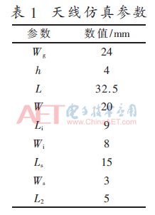 本文使用高频电磁场仿真软HFSS13.0作为仿真工具。利用式(1)~式(9),并经过参数优化可以得到天线的最佳设计参数,如表1所示。