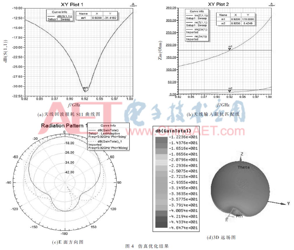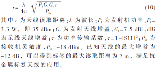 使用HFSS仿真优化后的结果如图4所示,在920 MHz,S11最小值为-31 dB,此时天线的输入阻抗为8+j178 Ω,表明与天线端口阻抗匹配极好。在860 MHz~960 MHz的频段内,S11<-15 dB的相对带宽为11%,表明天线满足不同国家的频率要求。根据天线的方向图,通过式(10)[10]计算天线的读取距离: