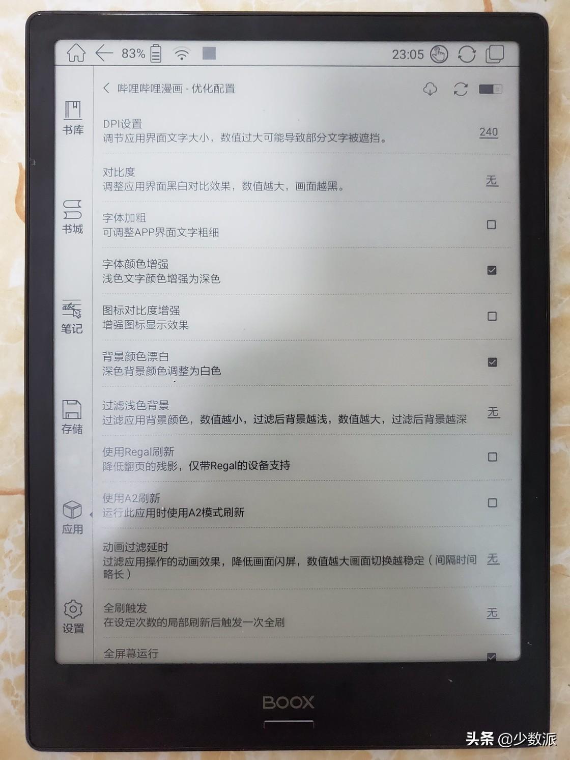 对于非应用商店安装的第三方 App,文石 BOOX Note 还提供了详尽的显示优化选项。例如增强对比度、调整 DPI、文本字体加粗和颜色加深、过滤浅色背景和动画效果等,让 App 在电子墨水屏上使用时更舒心。