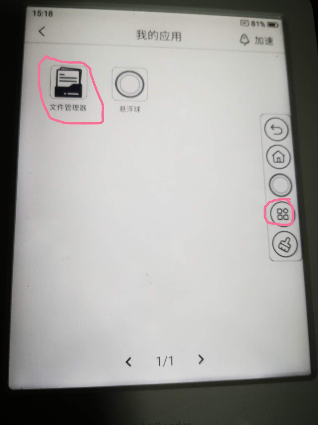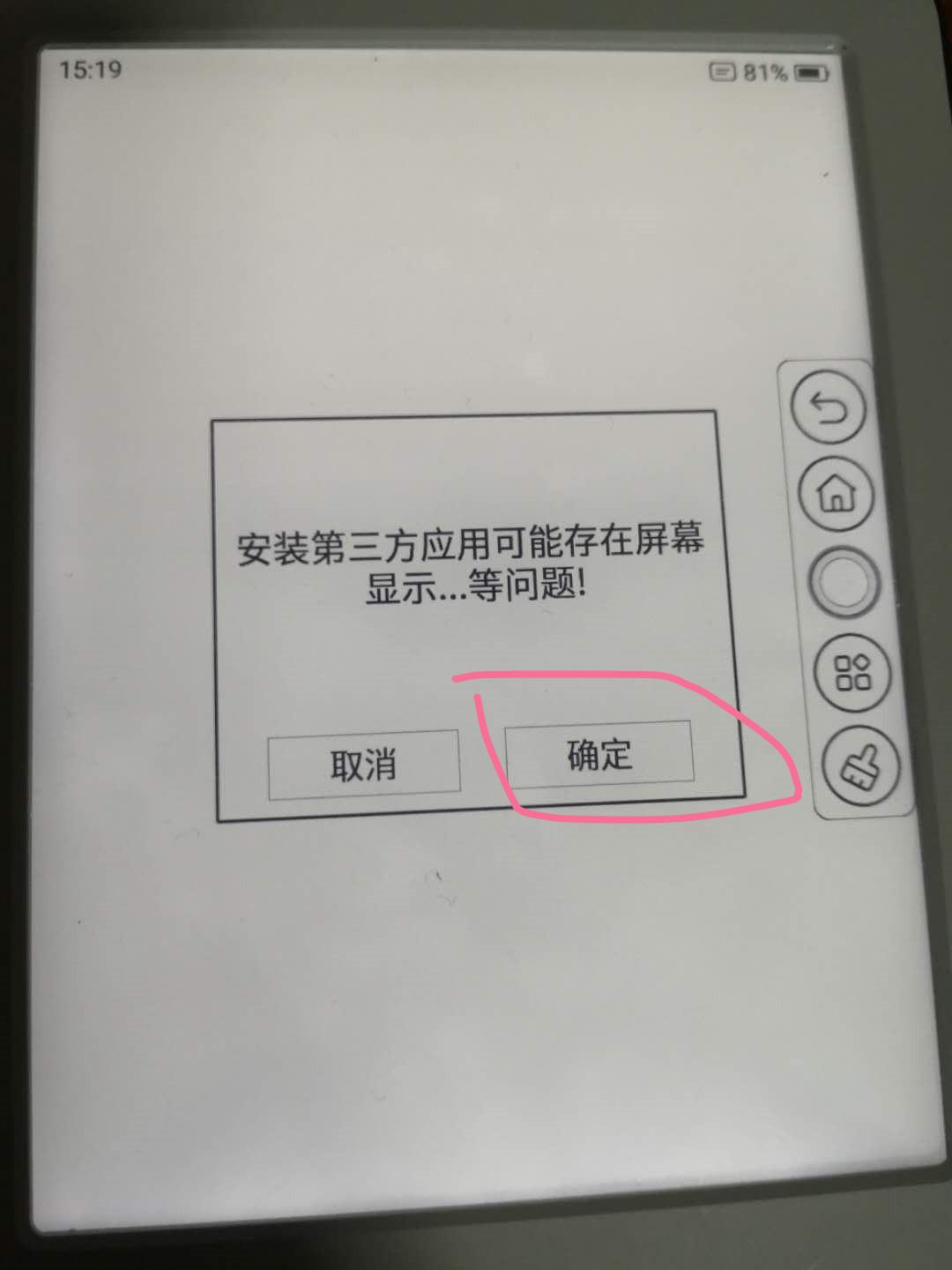 (1)点击悬浮球,点击第四项,进入“我的应用”,选择文件管理器,进入内部存储,再点击根目录下面的“微信读书墨水屏版.apk”文件,会弹出“安装第三方应用可能存在屏幕显示...等问题”,选择“确定”。