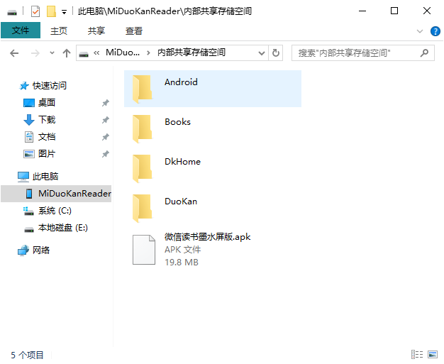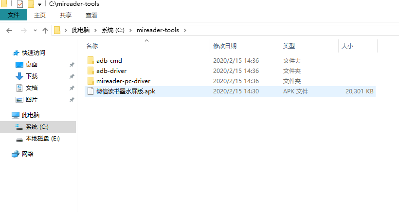 这时候进入C盘,将“mireader-tools”文件夹里的“微信读书墨水屏版.apk”拷贝至电纸书根目录下面。