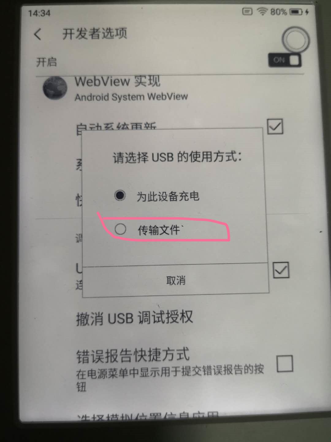 (二)打开小米多看电纸书开发者选项,可以实现USB传输文件。