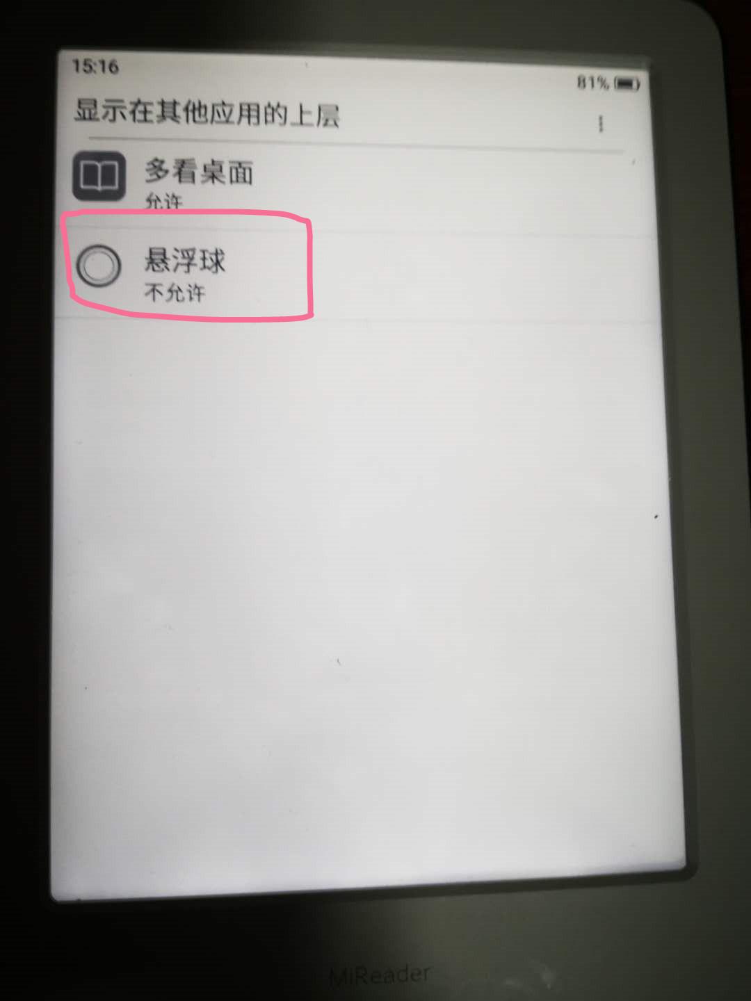 3.重新开机后,出现如图的提示,点击“”悬浮球“”,进入设置,勾选 “允许显示在其他应用的上层”。再次重启。