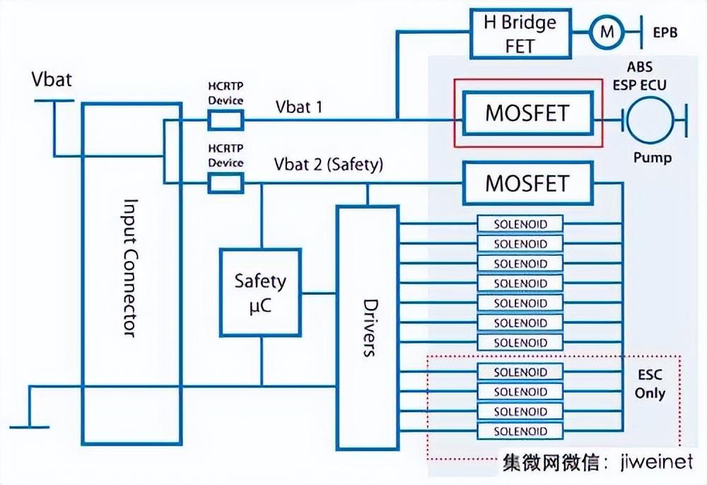 此款元件能提供必要的特性以满足OEM厂商的保护要求,由于该元件通过了汽车等级(AECQ)认证,并与表面安装元件(SMD)回流焊制程相容,所以组装成本低且可靠性高,更采用扁平封装,使其能安装在微型化的PCB之内;其220°C的典型开启温度让它适合引擎盖下的应用;并具有较高的操作能力,23°C时的标称正向电流是90A,140°C时是45A;它具有较低的电阻,大约100μOhm,因而耗散和电压降均较低。 HCRTPmini元件能在室温下耐受达90A的保持电流,并且在140°C下耐受45A电流。由于HCRTPmini元件是SMD元件,稳态操作电流的性能取决于PCB布局和板子上的热管理。这款扁平的HCRTPmini元件能以无铅表面安装元件和回流焊装配制程来安装;相较之下,径向引线热保险丝必须在回流焊之后安装或者弹片安装需要额外治具装卸,更加节省装配成本、空间和更稳定可靠。 越来越多的新车可提供先进的ABS模组,此模组在同一块电路板上整合电子稳定控制(ESC)/电子稳定程式(ESP)系统,以及电子停车煞车(EPB)系统。虽然此种整合方法可降低整体汽车架构的设计成本,但也增加板上的部件密度,加上功率变大,上述因素都可能导致灾难性的故障。 许多OEM厂商都会要求在接近输入连接器的地方,提供不可逆的热保护,以防止内部模组温度超过200°C以上时,热量往汽车外传递。在须要进行热保护的典型汽车应用中,会在汽车的接线盒内放置电流保险丝,这是假设发生热事故时,电流保险丝将烧断,并解决问题;然而此假设并不正确,因为要提供充足的保护,除电流保险丝外,更需要过热保护装置。 除了ABS模组的典型保护方法外,设计人员也可在板上输入连接器附近安装两个HCRTPmini元件。在每种情况下,HCRTPmini都将充当最后防线的解决方案,以协助防止模组出现热事故;所谓的热事故,是指汽车本身将因此造成损坏而须维修。 在ABS应用中,出于安全原因而需要冗余的电源线。为了对整合式的ABS平台提供热保护,可在阀门/螺线管(Valves/Solenoid)和油泵马达(Oil Pump Motor)等两个区域使用HCRTPmini元件。 如下图的方块图所示,一个HCRTPmini元件放在接近板上输入连接器(Vbat 1)之处;第二个HCRTPmini放在电源线(Vbat 2)上,它是专门用来对安全微控制器单元和螺线管提供大约20Arms电流。