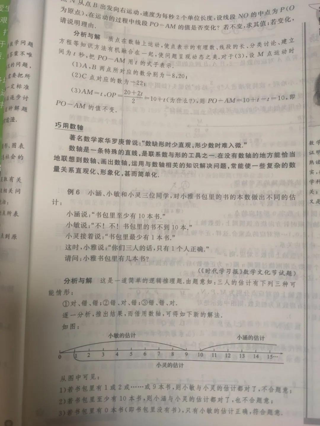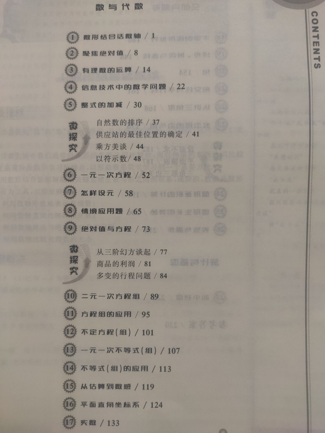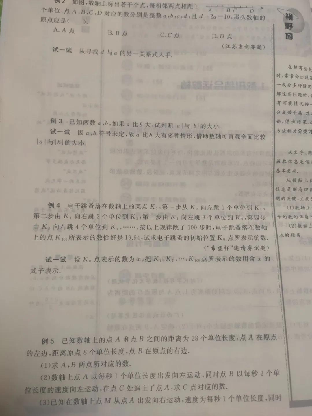 内容大致是和人教版的七年级数学教材一致,但又突出了重难点,像一开始的数轴和绝对值,在课内教材上都有涉及,但难度不够,在考试中反倒会出一些比较难的题目,这种编排就比较符合实际一些。
