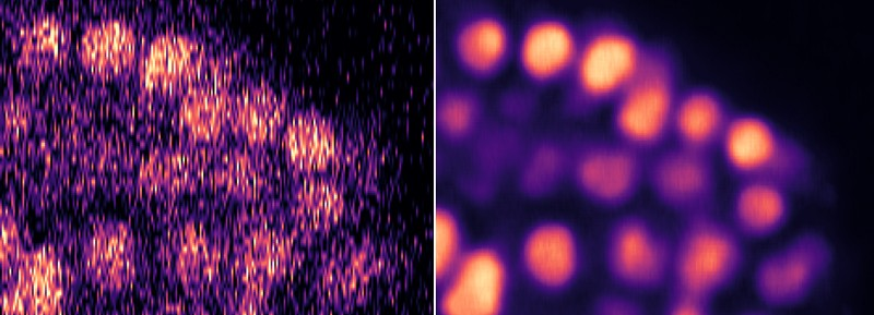 图像更清晰 噪声是图像中非真实信号的总和,照明度越弱,图像噪声越大。这可以解释为什么夜间用手机拍照会有颗粒感,更不用说用于保护脆弱的样品的微光显微照片。生物学家站在计算机的肩膀上,对图像不断校验并选择正确的降噪方法。为了将图像噪声最小化,研究人员长期以来一直采用降噪算法,最早是一种由计算机科学家开发的数学过程,然后进入了深度学习时代, 通过将图像传递给计算机并允许它们制定出最佳的降噪方案,研究人员看到了令人惊叹的结果。瑞典乌普萨拉大学国家SciLifeLab生物图像信息学设施负责人Carolina Wählby使用一种称为Top-Hat的算法来清除荧光显微照片和其他图像中的背景噪声。Top-Hat执行一种数学转换,以从图像中去除过亮或过暗的元素。研究人员表示:在许多情况下,类似的方法的确非常有效。由Jug及合伙人一起开发的CSBDeep是一个在线的机械学习工具箱,可以与Fiji图像处理环境或Python编程语言一起使用。同样,Ouyang的网络应用软件ImJoy为多种机器学习方法的测试提供了一站式服务。具体内容可参考ScienceAI之前的报道《机器学习消除噪声,让显微镜图像更加清晰》。