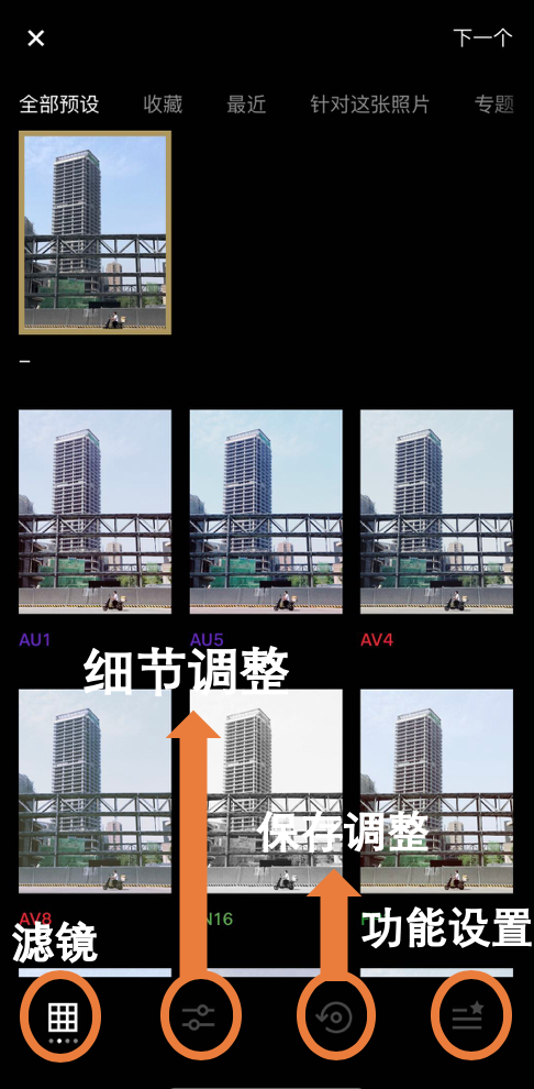 底部四个工具栏是滤镜——细节调整——保存调整——功能设置