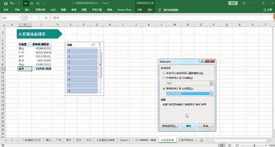 在行标签的数据项,【排序】【其他排序】 ,选择根据【销售额】 降序从大到小 排序,当数据源发生变化后,排序依旧根据销售额大小排序。