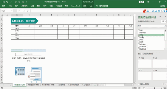 选中数据源,建立数据透视表后。分别拖动【城市】【月份】 字段到【行】【列】 区间,最后拖动【销售价】 到【值】 区间,即可快速汇总统计数据。