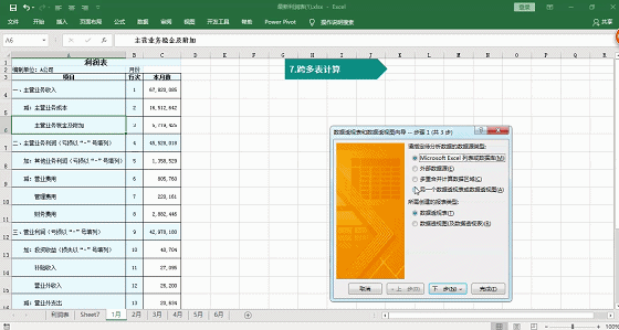 也是按住依次按下Alt D P 键盘(不能一起按),调出数据透视表向导。【多重合并计算】 ,【自定义字节】, 依次选择【1月-6月】工作表的数据源分别添加,最后根据实际,选择【3个字段】分别命名后,确定即可。