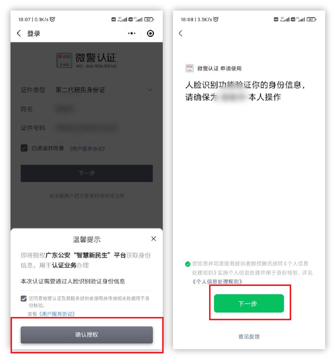 允许之后还会弹出一个框,需要进行人脸识别 ,点击确认授权 ,再次点击下一步,就会进行人脸识别。