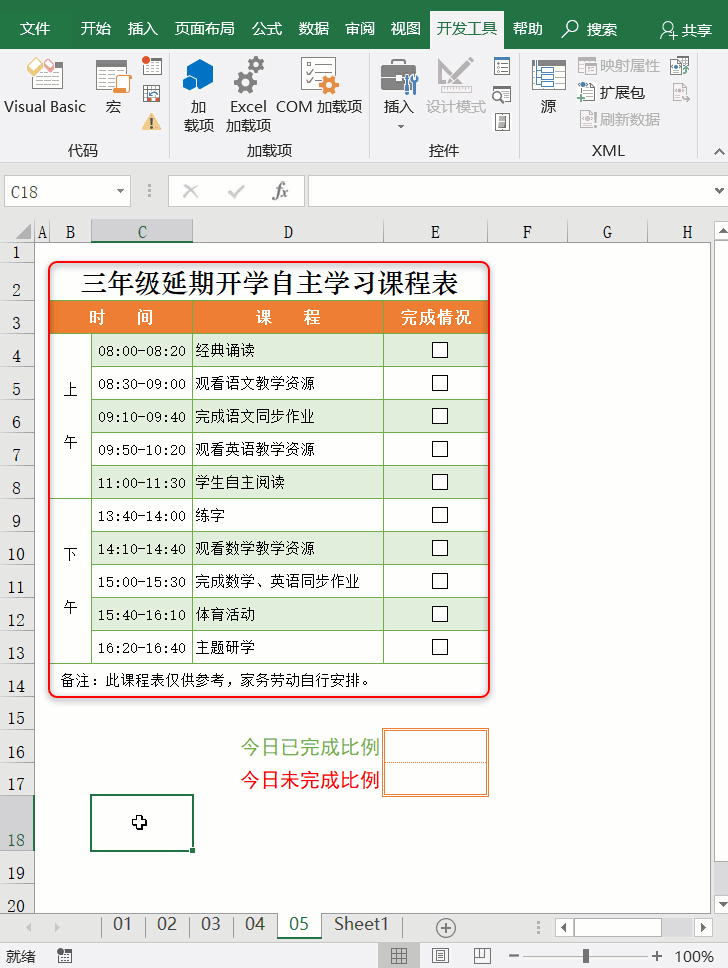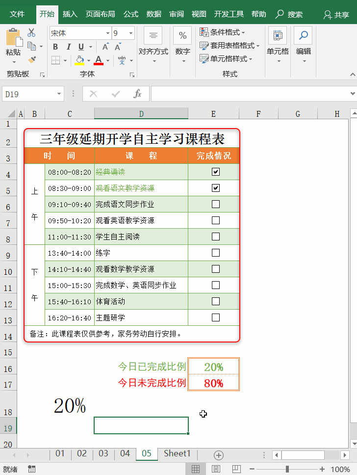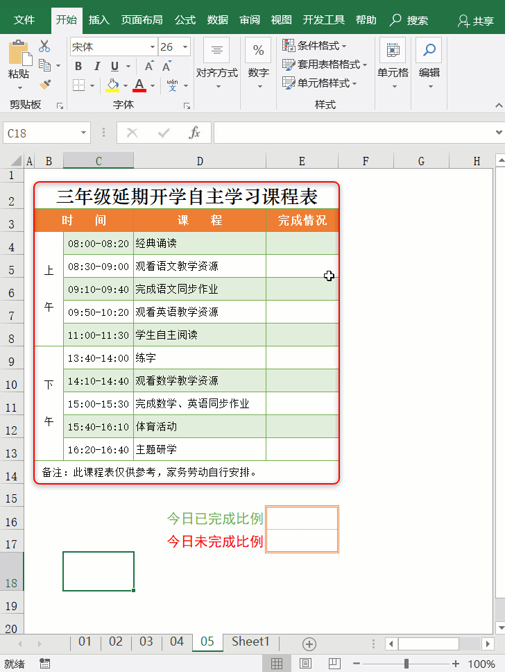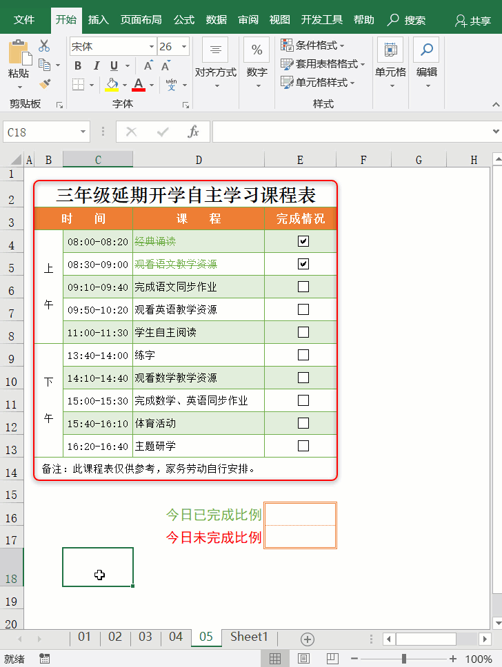 用Excel做个课程表,让孩子自主学习,课程完成情况直观、漂亮
