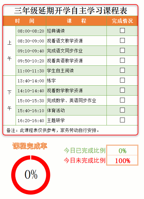 【说明】课程表中完成一项,在完成情况里打勾,课程内容上会添加删除线,并以绿色字体显示,下方会显示完成和未完成比例,图表指示的完成情况,绿色代表完成,红色代表未完成。
