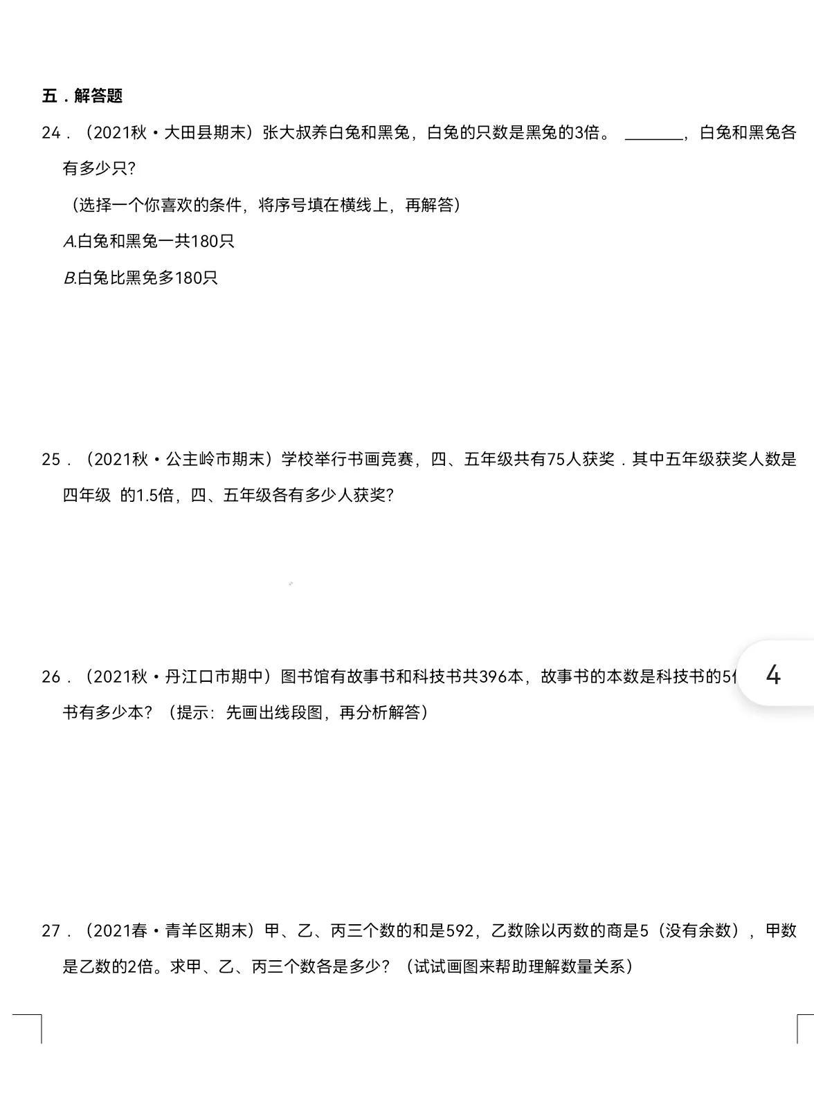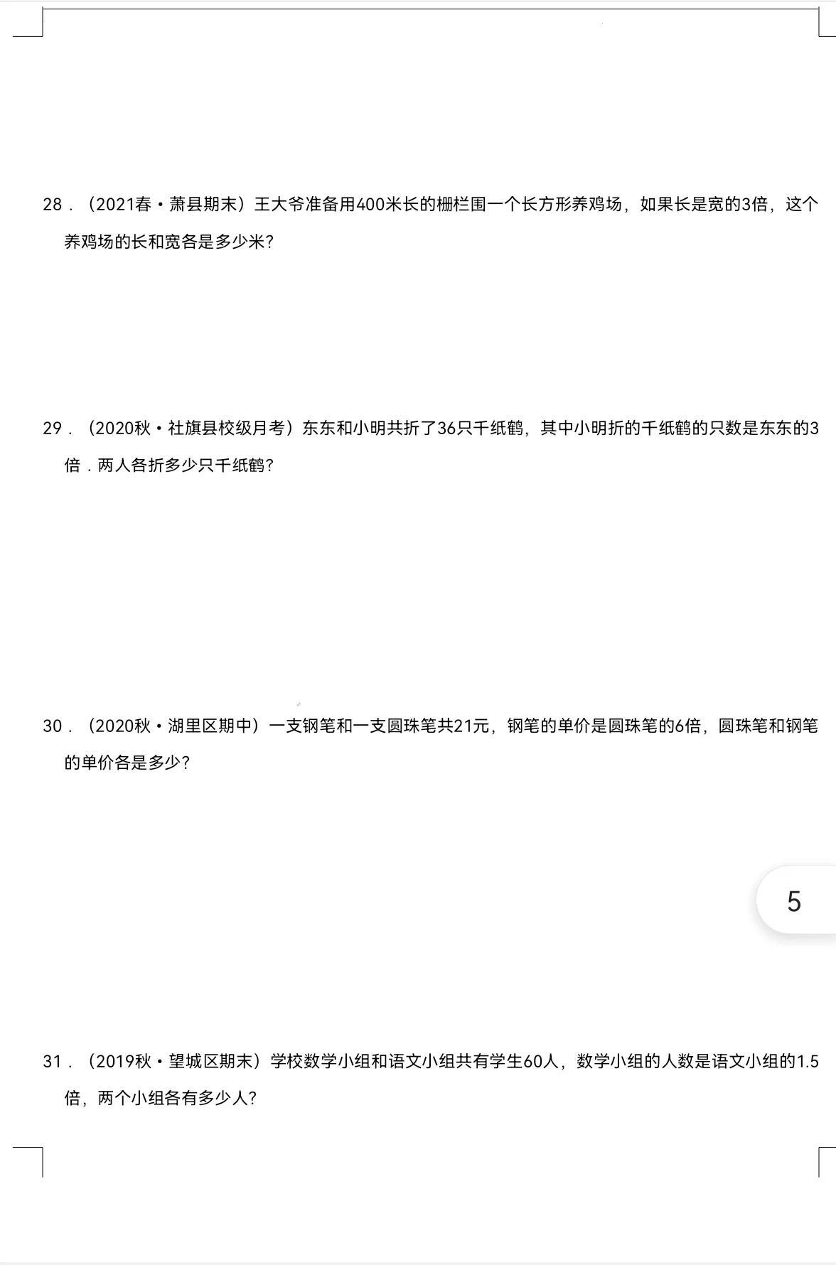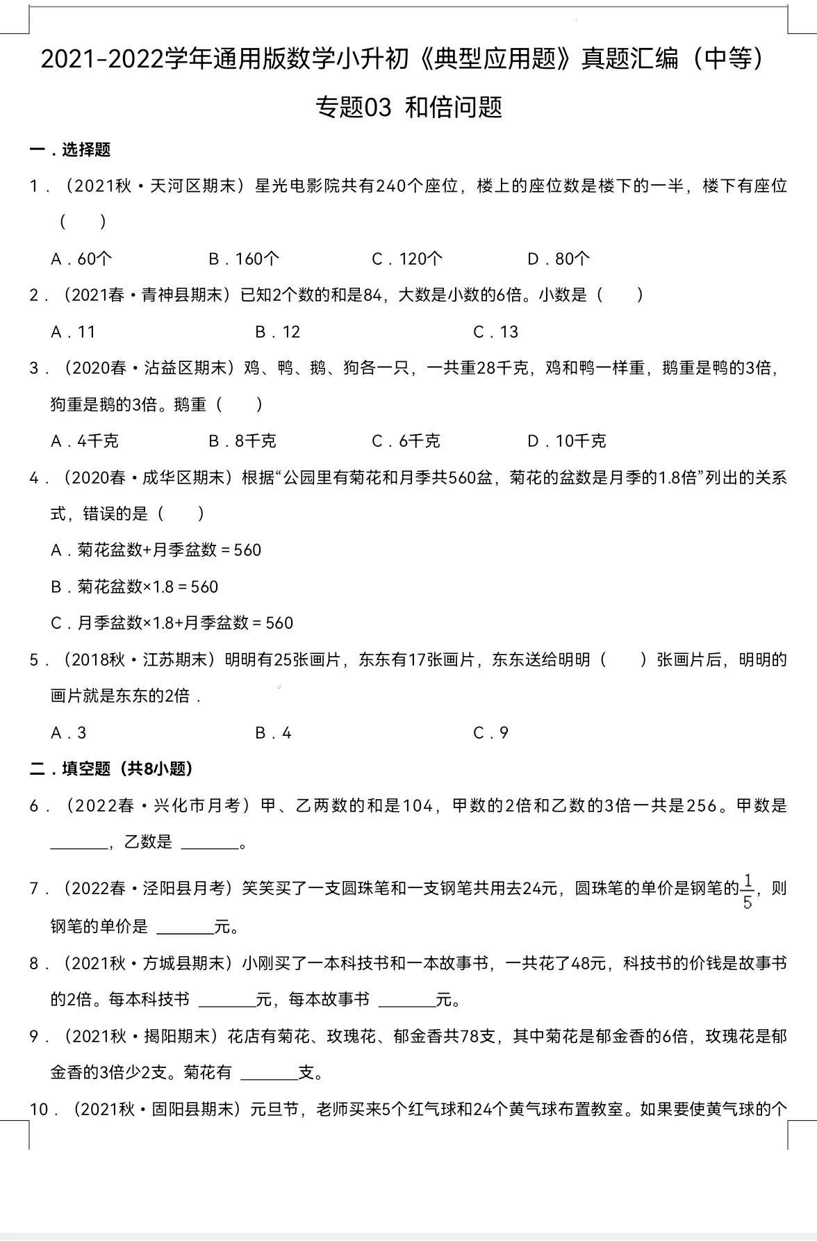 数学小升初典型应用题真题汇编 可以提供电子版和答案 和倍问题