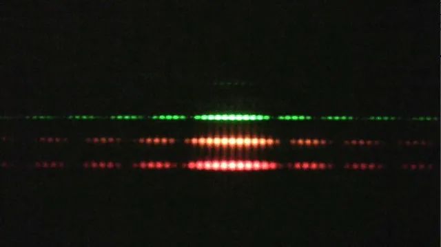 绿光、橙光和红光的双狭缝干涉图样。来源:Ars Technica,麻省理工学院。