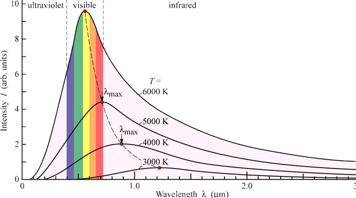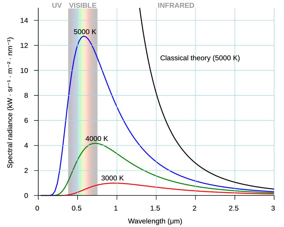 温度高于绝对零度的任何物体都会因热辐射而损失能量,这种辐射被称为黑体辐射。 黑体是不反射任何入射辐射的理想物体,因此从黑体上检测到的任何辐射都必然是热辐射。当人们测量黑体辐射的频谱时,结果如下图所示: