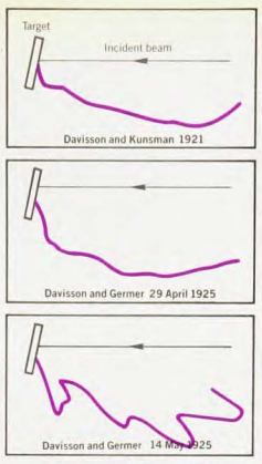 这些图片中的紫色曲线显示了各种角度的散射强度,黑色箭头表示入射电子束。第一张图片显示了早期结果。第二张图片显示的是1925年管子破裂前的实验结果。第三张图片显示的是维修后的结果。