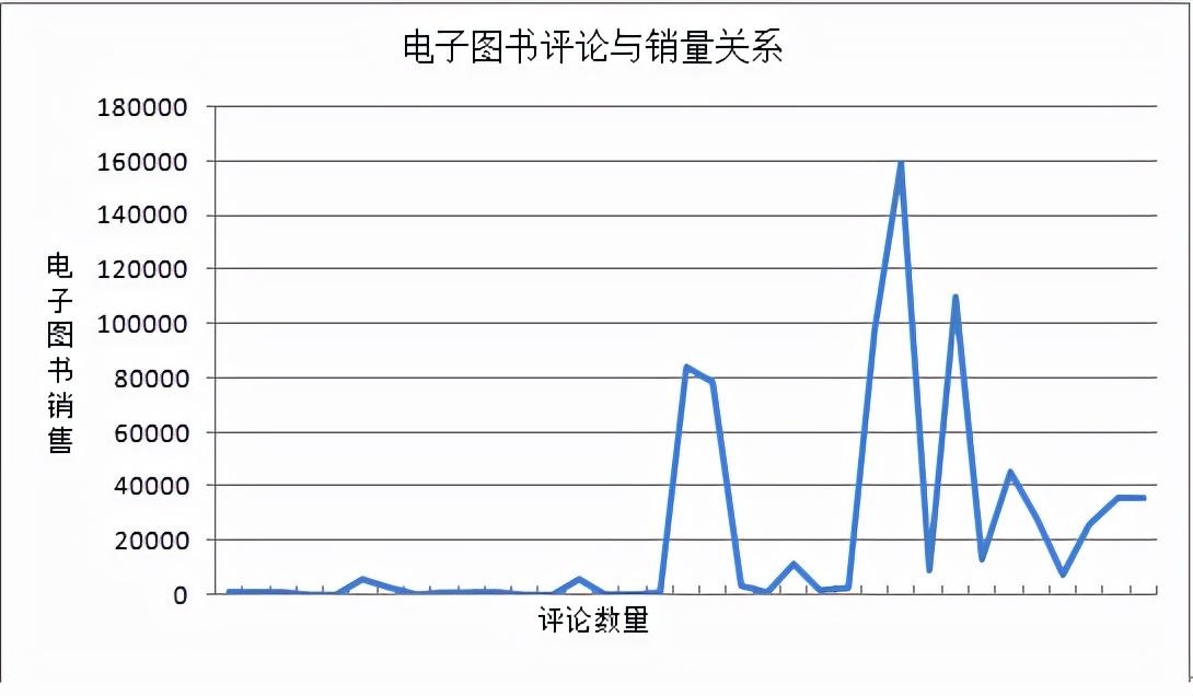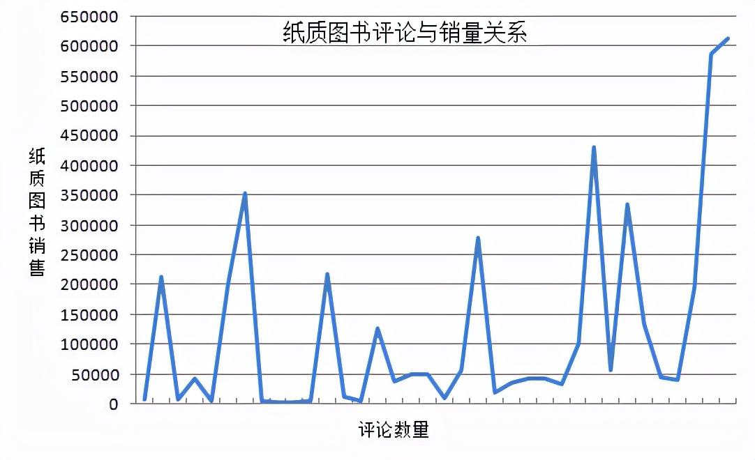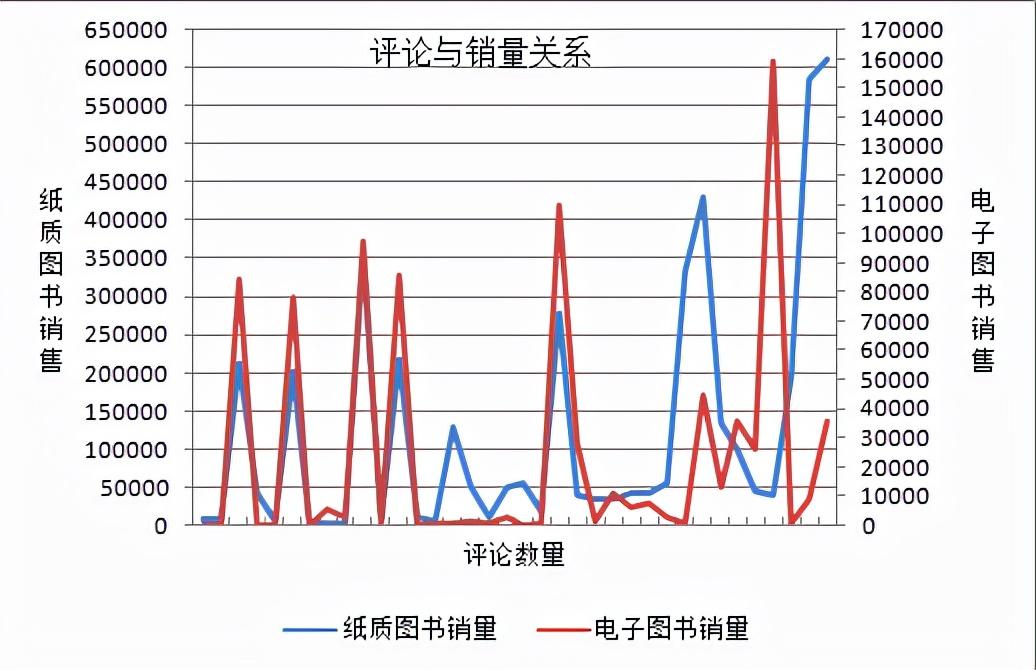 从数据观察来看,整体上交互功能有助于提高纸质图书和电子图书的销售量。由于出版社纸质图书和电子图书的销售渠道或者平台众多,且各自的优势渠道并不重叠,前者以京东和当当为代表,[33]后者以亚马逊和掌阅为代表。[34]基于这一现状和第三方平台(例如)分享数据无法获取等因素,本文通过评论数据与销售数据对交互功能与销售之间的关系进行观察分析,纸质图书以京东与当当的评论数据为依据,电子图书以亚马逊和掌阅的评论数据为依据。为了排除图书类别的干扰,本文首先选择37本文学类图书在2020年6月至2021年6月期间的评论与销售进行观察,从图4-9可以看出,尽管图书销量并未随着图书评论(纸质图书评论+电子图书评论+豆瓣评论)的增长同步增长,但是从整体上看,图书评论数据的增长多数情况下会带动纸质图书和电子图书的销售增长。随后对这37本图书在同一期间的纸质图书评论与销售进行观察,尽管纸质图书的线下销售占有两成以上市场,[35]我们仍然可以从图4-10看出,图书评论数据的增长对于纸质图书的销售增长具有正面促进作用。最后我们针对这些图书在同一期间的电子图书评论与销售进行观察。尽管电子图书的馆配市场(依《信息网络传播权保护条例》电子图书的借阅仅限于馆舍内)占据相当大的比例,亚马逊和掌阅的电子图书评论数据也只是诸多大众化电子图书平台评论数据的一部分,但是从图4-11仍然可以看出,图书评论数据的增长对于电子图书的销售增长作用更为明显。