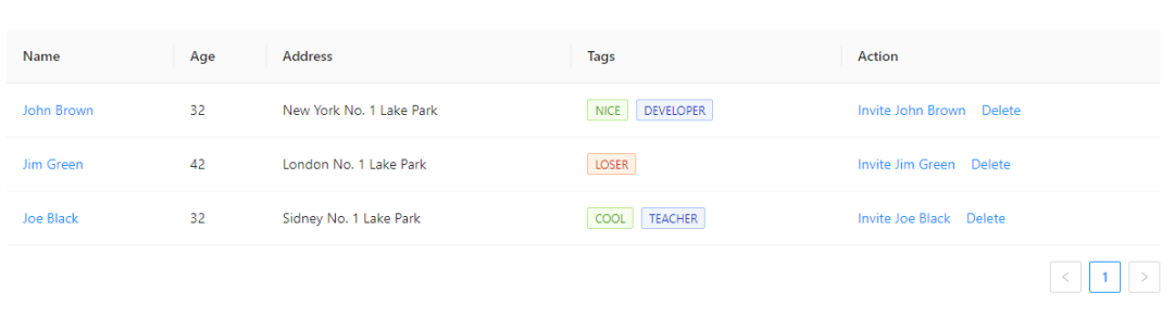 常规型表格:表格只做数据展示和维护,可支持增、删、改、查等数据维护的功能操作,表格数据可采用分页展示,分页模式分为翻页和分页加载两种形式,表格中又分为是否带有选框,带有选框的表格可支持批量操作。 如下图是ant.design中的表格组件,表格右侧带有常规的数据功能操作,底部带有分页切换的组件,也是最常见的表格类型。