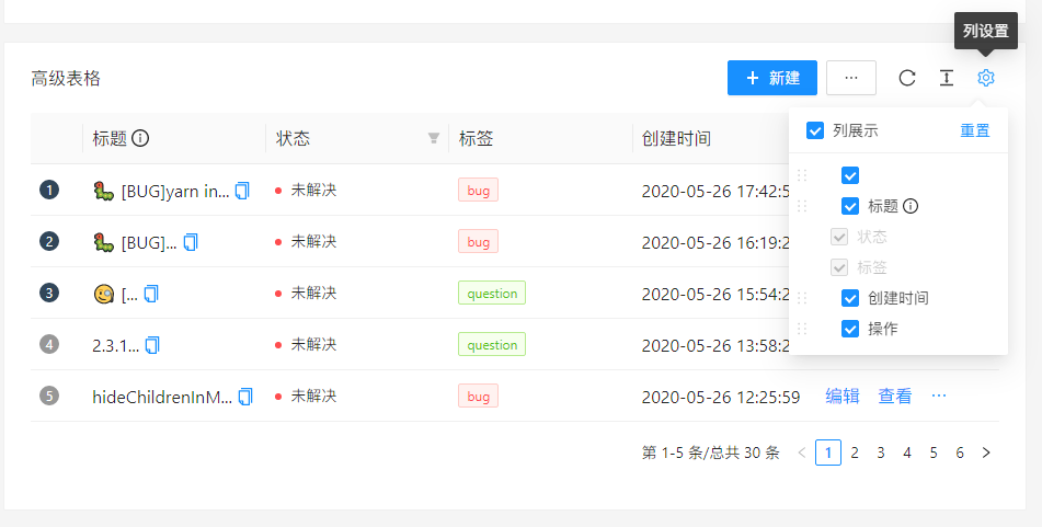 配置型表格:在常规表格基础上,可满足表格的多项自定义配置,可调整表格中数据的排序,可调整表头的列数据展示或者隐藏,可设置列固定位置不跟随左右移动,可调整列宽度和行高度。