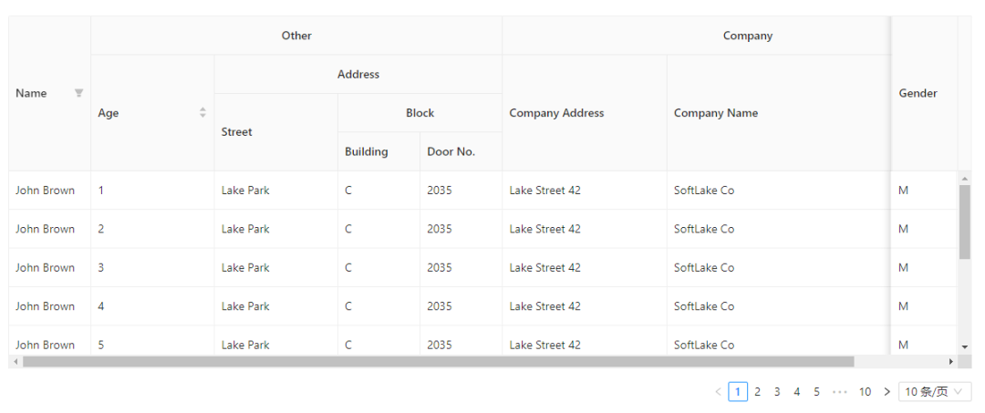 下图是表头多层级,一级表头占据宽度是下一级表头之和,下下级再逐渐递增,实现多层级的表头设置,上面的配置型表格的案例截图也是属于多层级表头的类型,可结合一起查看。