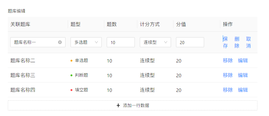 数据维护需求中可支持在表格中直接添加数据,在表格中直接输入信息并保存,不需要通过弹窗或者页面的形式来增加一条数据。通过“添加一行数据”实现新增一行数据,编辑完成后直接生成数据信息。这样的交互对于用户的理解和使用更加简单,并且可以更加快速高效的完成数据的维护。