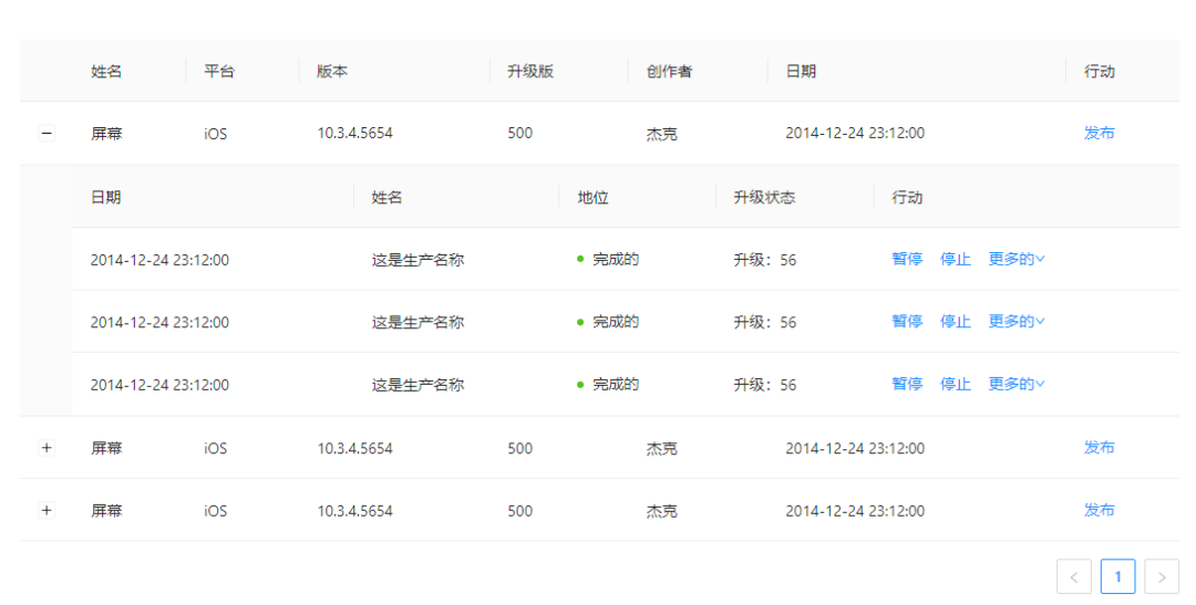 表格镶嵌小表格,也可以理解为多层级的表格,下图中的屏幕可以理解为一级数据,展开后展示该数据下的子集数据,只是子集数据是通过表格的形式展示,因为子集的数据所展示的列数据信息与主数据的列信息不同,所以需要单独展示,通过内嵌表格的形式,可以很好的展示数据层级关系,并且数据的维护和查阅更方便。