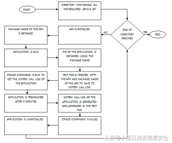 首先,我会安装一个Android模拟器Genymotion,构建一个沙箱,让每个应用程序都在其中运行,这样做是为了防止我自己的设备受到恶意应用程序的攻击。每个应用程序会运行大约5分钟以观察其行为,如此一来,这将产生一个使用“strace”命令生成的系统调用日志。系统调用日志的所有代码都是使用python脚本执行的,下图显示了日志生成的整个流程。
