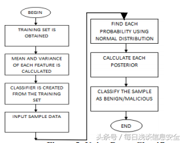 在创建数据集之后,我会提供三个算法来进行分析。第一个算法是朴素贝叶斯算法,它是用C语言来实现的。我会首先将训练集(刚创建的数据集的一部分)存储在Microsoft Access(用于数据库连接和存储)。其余部分存储在另一个表中,以提高获得未知样本的准确性。在此之后,我会根据每个特性以及计算出来的平均值和方差构建一个目标标识符表,用于对未知应用程序进行识别、分类。而在另一个表中,其每一行都代表一个未知样本,下图演示了朴素贝叶斯目标标识符列表生成的整个流程。