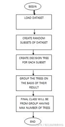 然后将相同的数据集利用第二个分类算法即随机森林算法再进行一次数据集的创建,在创建数据集之后,可以将其划分为随机子集。然后为每个子集创建决策树。根据创建的结果,这些决策树被重新分组。为了将未知样本标识为良性或恶意,我使用了最多树的组。下图显示了随机森林算法的整个流程。