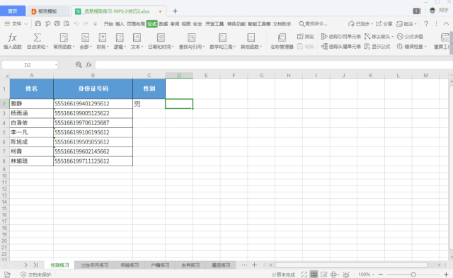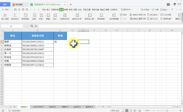 在 WPS 2019 中,不需要复杂的公式,你仅需选择选项卡中的「公式-插入-函数 」,点击常用公式-提取身份证性别或生日,接着选中身份证号码单元格即可提取。