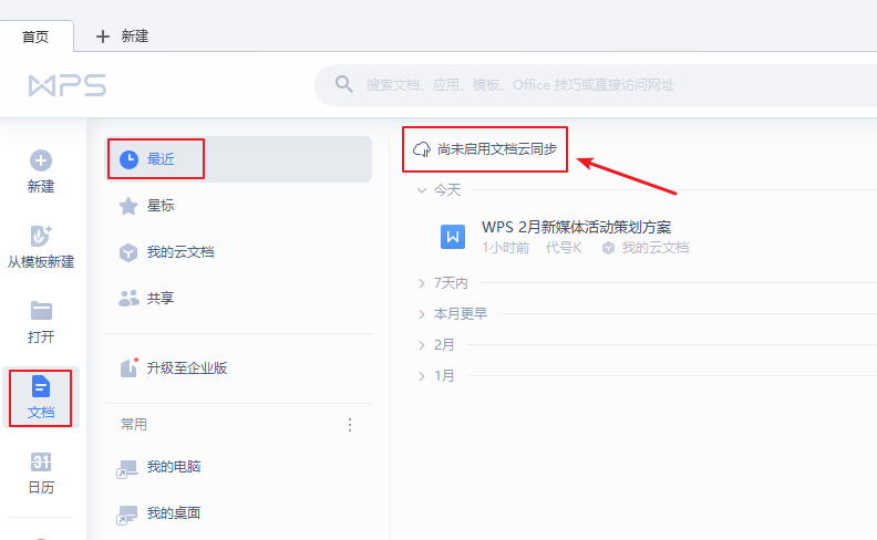 在 WPS 2019 中,点击首页的「文档—最近」,点击下图红框+箭头的位置,开启「文档云同步 」,每次文档保存便会自动保存至云端。