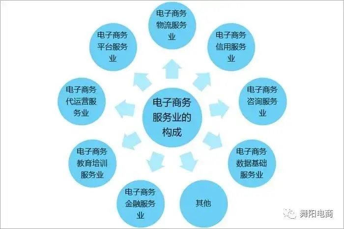 随着电子商务的发展,电子商务服务业也快速发展,其构成不断丰富。电子商务服务业在构成上主要包括:电子商务平台服务业、电子商务代运营服务业、电子商务物流服务业、电子商务信用服务业、电子商务咨询服务业、电子商务教育培训服务业、电子商务数据基础服务业、电子商务金融服务业等。作为一个新兴领域,电子商务服务业随着技术进步和商业模式的变革,其功能和发展热点也在动态调整,行业之间的渗透也在逐步加强。