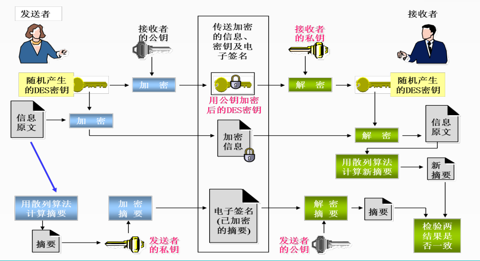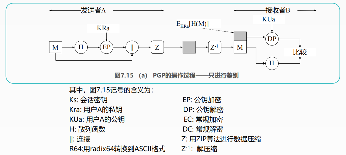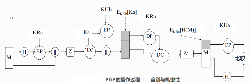 发送者产生消息M;用SHA-1对M生成一个160位的散列码H;H用发送者的私钥加密,并与M连接;接收者用发送者的公钥解密并恢复散列码H;对消息M生成一个新的散列码,与H比较。如果一致,则消息M被认证,即报文作为已鉴别的报文而接受。(提供DSS/SHA-1可选替代方案和签名与消息分离的支持。)机密性