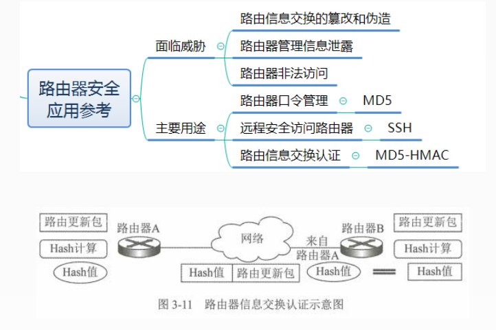 路由器之间需要进行路由信息的交换,以保证网络路由正常进行,因此需要路由器之间发送路由更新包。为了防止路由欺诈,路由器之间对路由更新包都进行完整性检查,以保证路由完整性。目前,路由器常用 MD5-HMAC 来实现 。如果路由信息在传输过程中被篡改了,接收路由器通过重新计算收到路由信息的 Hash 值。然后与发送路由器的路由信息的 Hash 值进行比较,如果两个 Hash 值不相同,则接收路由器拒绝路由更新包,