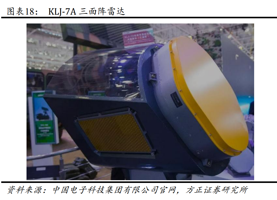 KLJ-7A 机载火控雷达是我国首个针对国际市场的机载有源相控阵火控 雷达,于 2016 年在第十一届中国国际航空航天博览会上首次亮相。 KLJ-7A 是 KLJ-7 的升级型号,KLJ-7 雷达为采用机械扫描平板缝隙天线 的脉冲多普勒雷达,KLJ-7A 采用有源相控阵技术,具备对空搜索、多 目标跟踪、空地和空海目标搜索与跟踪、高分辨 SAR 成像、高增益 ESM、 地形回避和气象等功能。