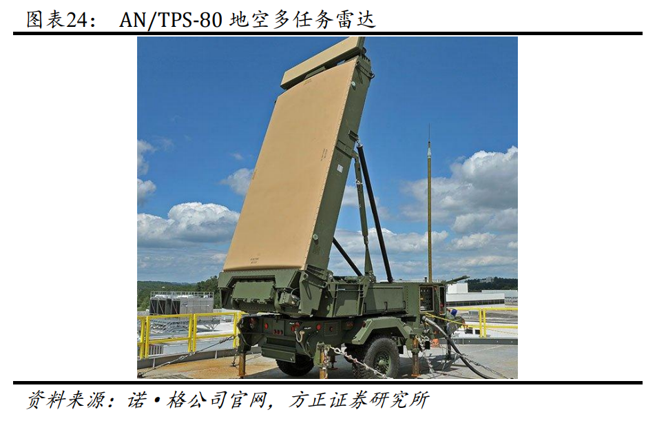 AN/TPS-80 地空多任务雷达采用有源相控阵体制,具有实时、360°态 势感知能力,可应对多种威胁,如固定翼飞机、直升机、巡航导弹、 无人系统,以及火箭炮、火炮、迫击炮等。该雷达采用最新的网络与 数字化波束形成技术,具备多任务能力,将 AN/TPQ-46、UPS-3、 AN/TPS-63、AN/MPQ-62 和 AN/TPS-73 雷达的空中监视、防空和反火 力目标获取能力整合到一起,以一个雷达取代了美国海军陆战队五个 单任务雷达,降低了运维成本并简化了训练难度。AN/TPS-80 雷达采 用开放式系统架构,便于后续升级、扩展,并且兼容国防部多个指挥 控制网络。新一代的 AN/TPS-80 雷达采用了先进大功率、高效氮化镓(GaN)天线技术,诺²格公司于 2018 年将首部 GaN 天线 AN/TPS-80 地空多任务雷达交付美国海军陆战队。