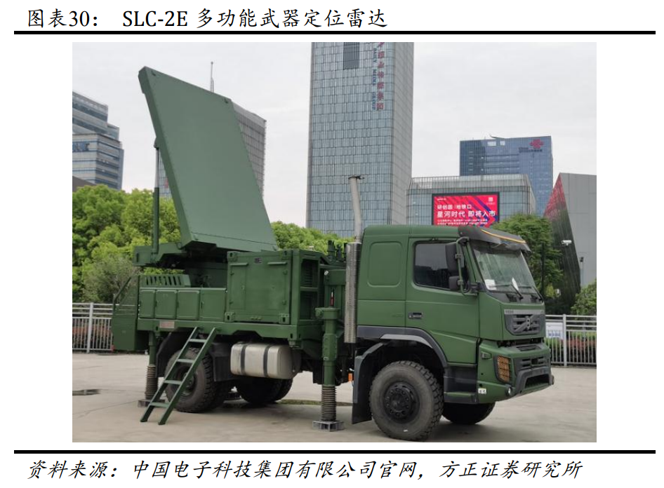 以前我国的武器定位雷达主要依赖进口,且数量非常少,只能看迫击 炮,不能满足作战需求。中电十四所打破国外技术封锁,推出了 SLC-2E 多功能炮位雷达、SLC-7 和 SLC-12 多功能雷达等。SLC-7 雷达具有警戒 和火炮定位等功能,被誉为“全能冠军雷达”;SLC-12 多功能雷达可 为现代防空作战提供远程警戒、早期预警、目标指示、跟踪制导等功 能。