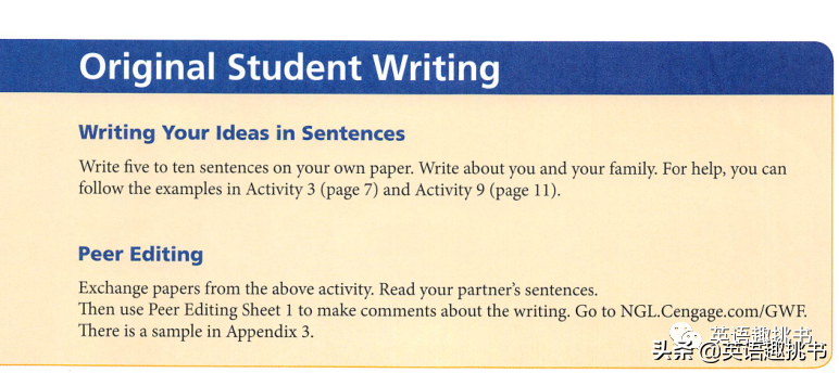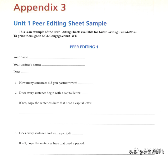 每单元的Peer Editing设计很用心,让同伴/同学交换各自的作文来修改。