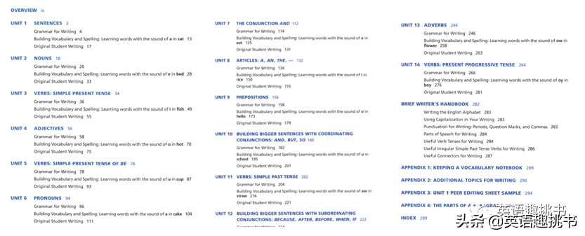 每单元三部分学习内容:学习写作中用到的语法、词汇选择和学习者的写作练习。