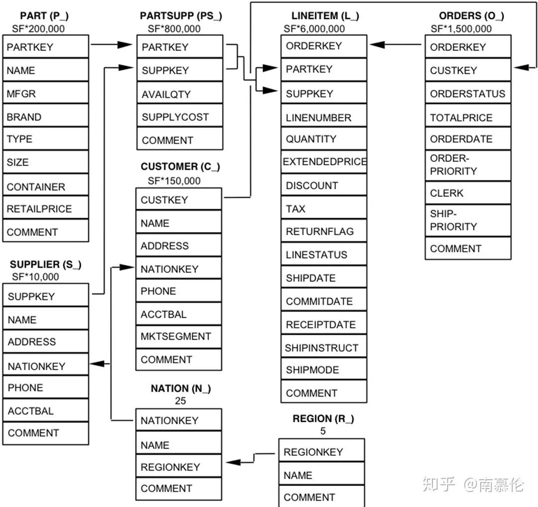之前说了,为了方便查询的实现和对查询进行优化,加入了各种范式。但是这些范式往往限制了我们用直接的方法去建立模型。比如说,一个常用的数据库测试数据集是TPC-H,先来看看它的表结构: