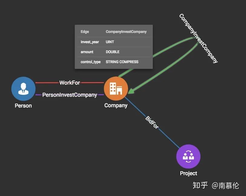 在这个问题上,图数据库的建模就比关系型数据库直观很多。如上图所示,这是一个用来表示公司之间投资关系的Schema,如果是关系型数据库,CompanyInvestCompany需要单独建一个表来存储,查询的时候需要Company JOIN CompanyInvestCompany JOIN Company,作两个JOIN操作,非常耗时,而图数据库只需要一步。