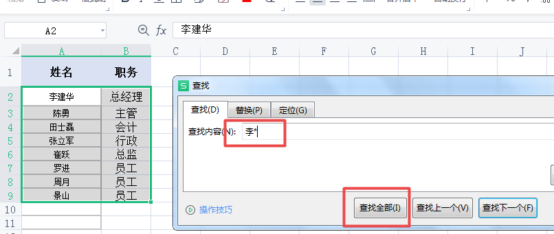 *主要代表【通配符】。比如下图中查找“李”姓的记录,可以直接选中区域按【Ctrl+F】打开“查找和替换对话框”,在查找中输入【李*】,然后点击查找全部即可