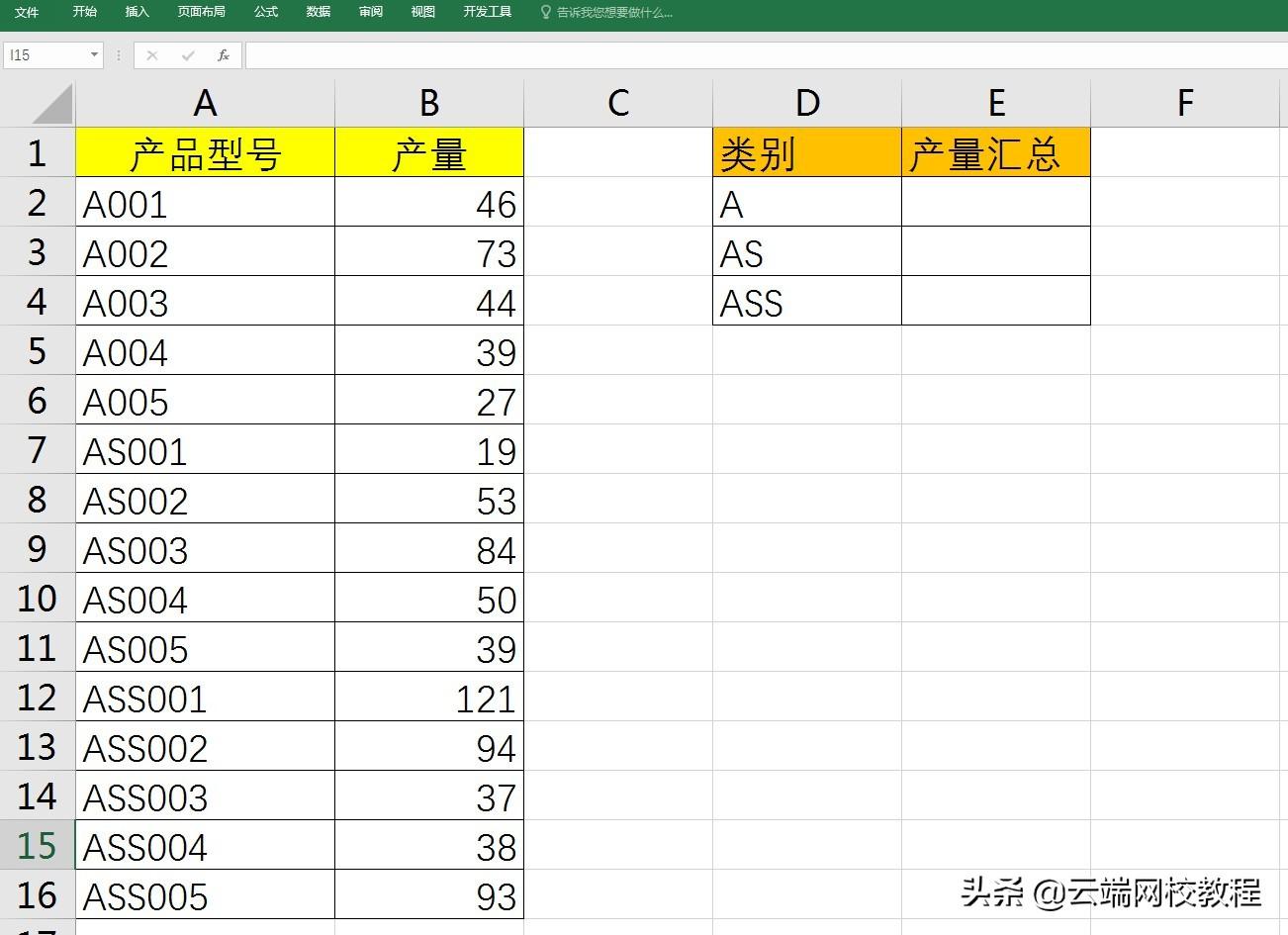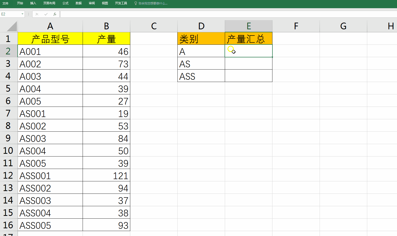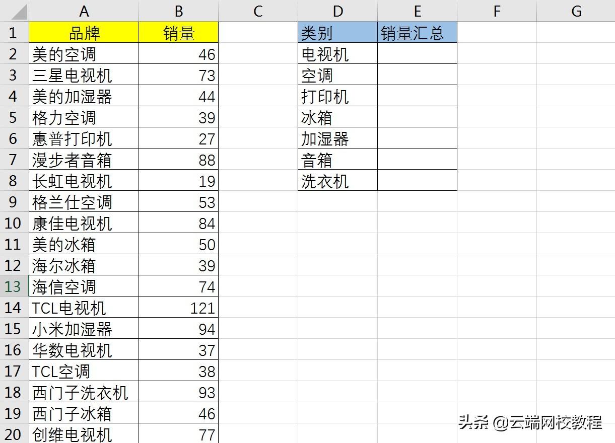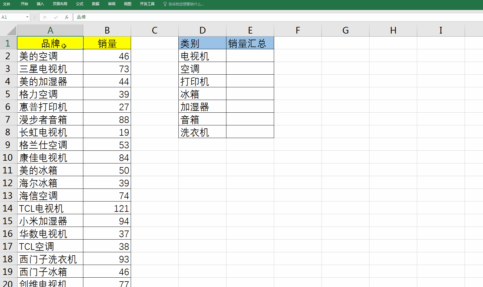 这是一张简单的电器销售表,我们想要计算每种类目电器的销售总和。但是每种电器又有多个品牌,这种情况下我们就需要借助通配符了,操作如下。