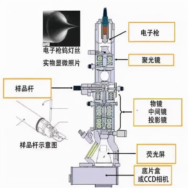 l 电子枪: 发射电子。由阴极,栅极和阳极组成。阴极管发射的电子通过栅极上的小孔形成射线束,经阳极电压加速后射向聚光镜,起到对电子束加速和加压的作用。l 聚光镜: 将电子束聚集得到平行光源。l 样品杆: 装载需观察的样品。l 物镜: 聚焦成像,一次放大。l 中间镜: 二次放大,并控制成像模式(图像模式或者电子衍射模式)。l 投影镜: 三次放大。l 荧光屏: 将电子信号转化为可见光,供操作者观察。l CCD相机: 电荷耦合元件,将光学影像转化为数字信号。
